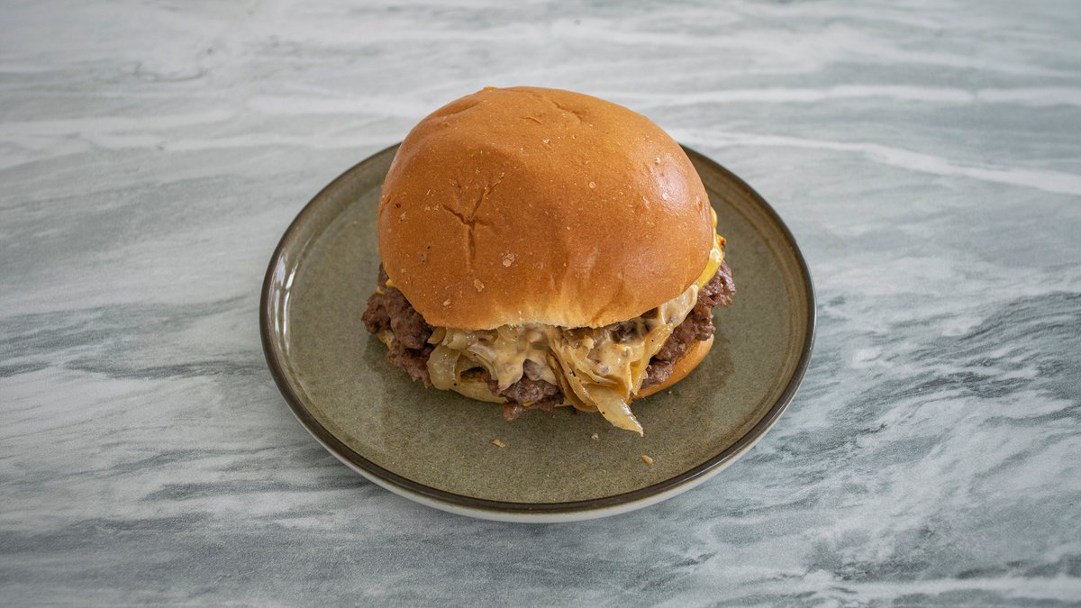 Ψωμί μπριός, τριπλό 100% μοσχαρίσιο μπιφτέκι, τσένταρ, πίκλα αγγουριού, τσιπς κρεμμυδιού, bbq σως