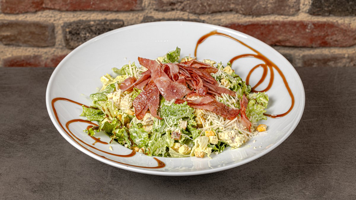Σαλάτα με μαρούλι, κρουτόν, κοτόπουλο, καλαμπόκι, μπέικον, τυρί και sauce Caesar`s
