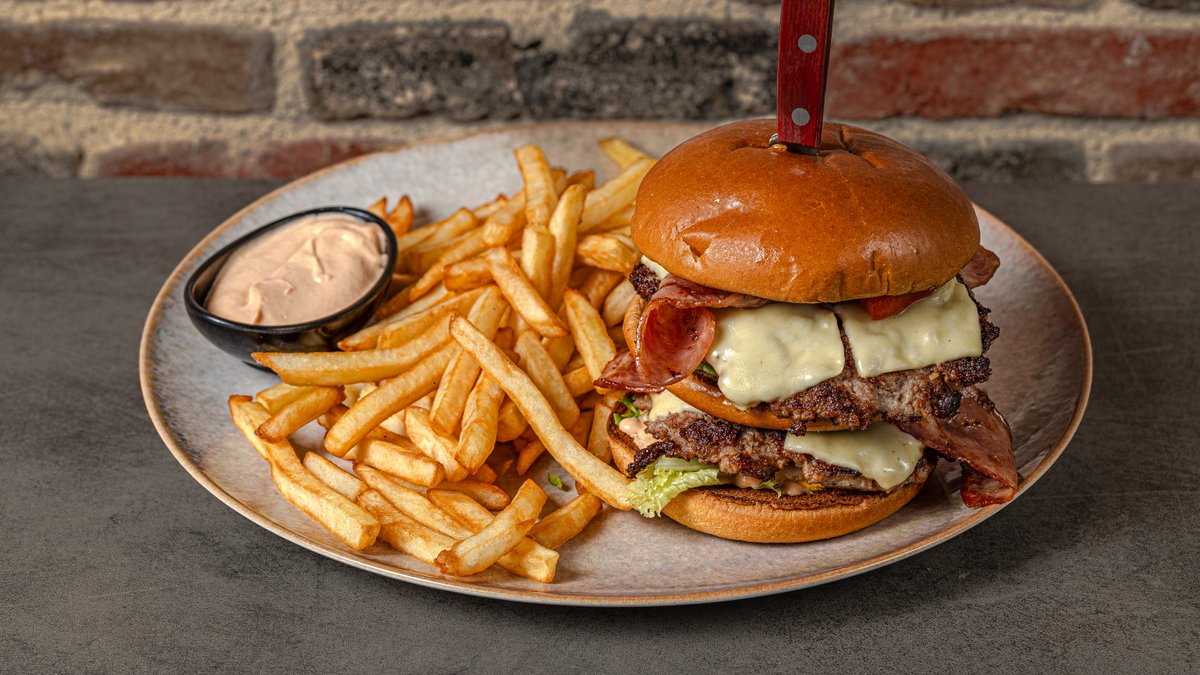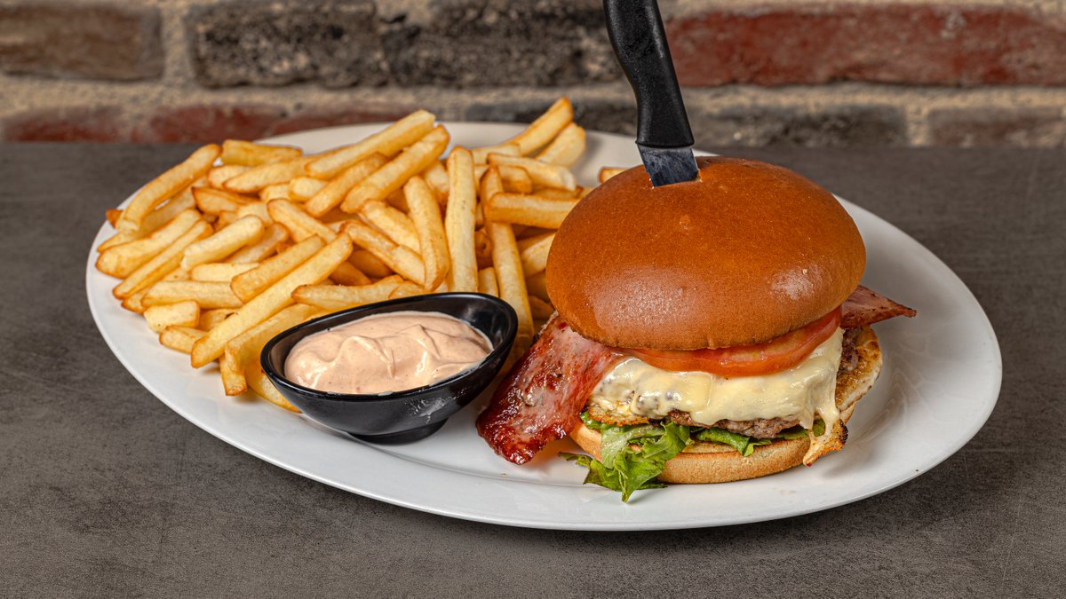 Με μπιφτέκι ανάμεικτο, ζαμπόν, τυρί, μαρούλι, ντομάτα, μπέικον και σως. Συνοδεύεται από πατάτες τηγανητές της επιλογής σου