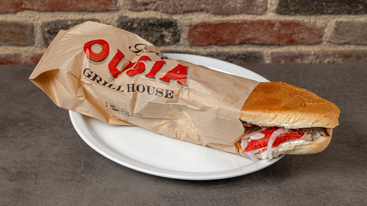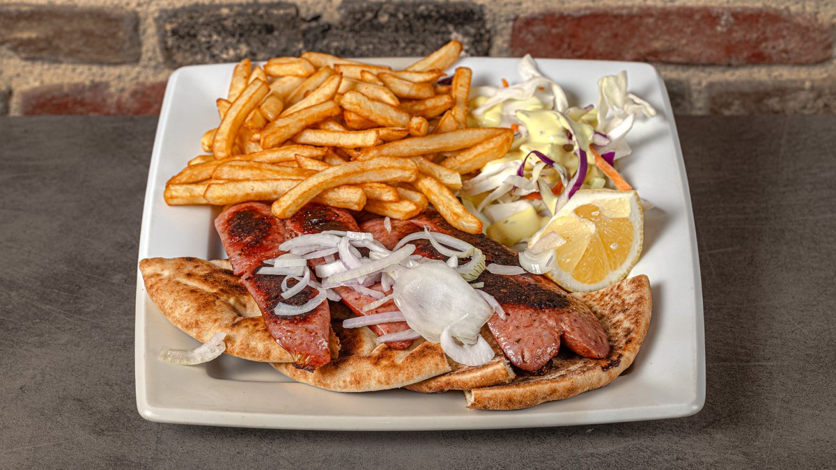 Συνοδεύεται από ντομάτα, κρεμμύδι, τζατζίκι, πίτα και πατάτες τηγανητές