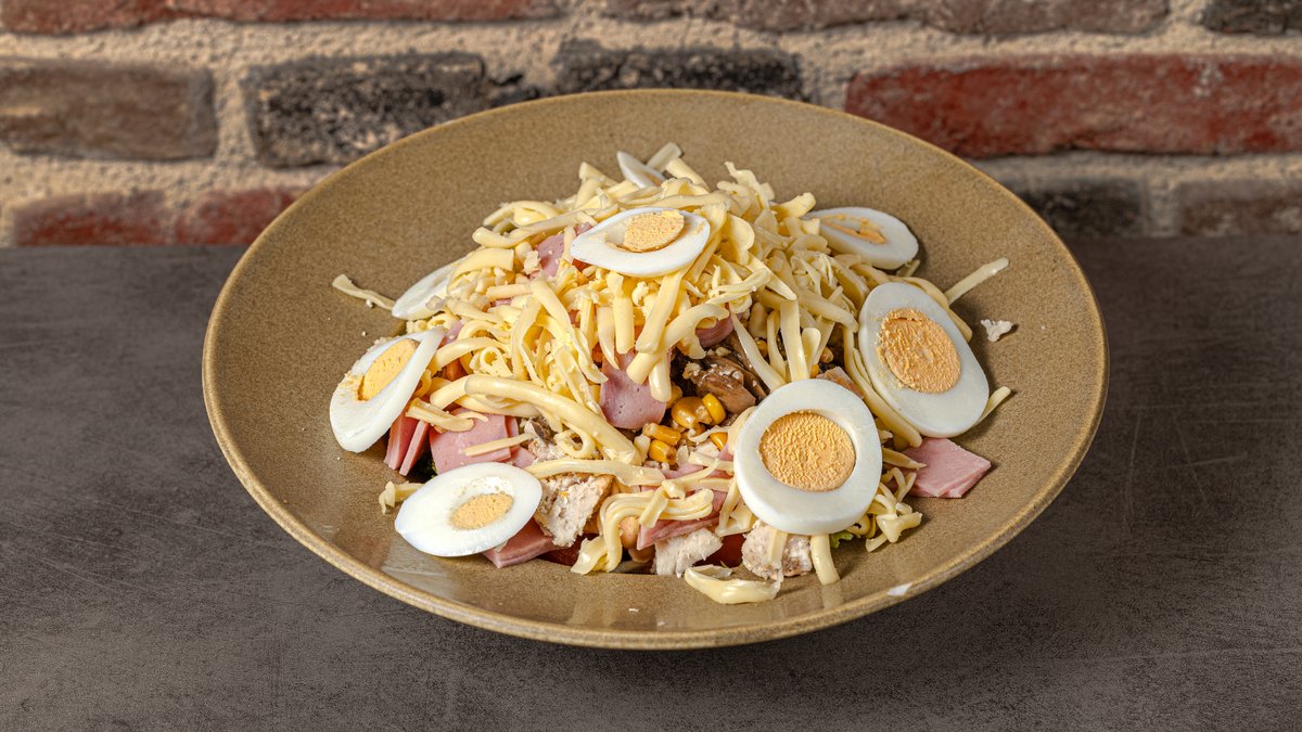 Σαλάτα με μαρούλι, ντομάτα, πιπεριά, αγγούρι, καλαμπόκι, μανιτάρια, σως, ζαμπόν, τυρί, αυγό, μπέικον και κοτόπουλο βραστό