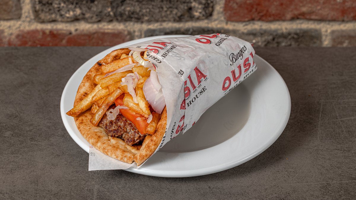 Με 3 πιτάκια, μπιφτέκι ανάμεικτο, τυρί, ντομάτα, μαρούλι και σως. Συνοδεύεται από πατάτες τηγανητές της επιλογής σου