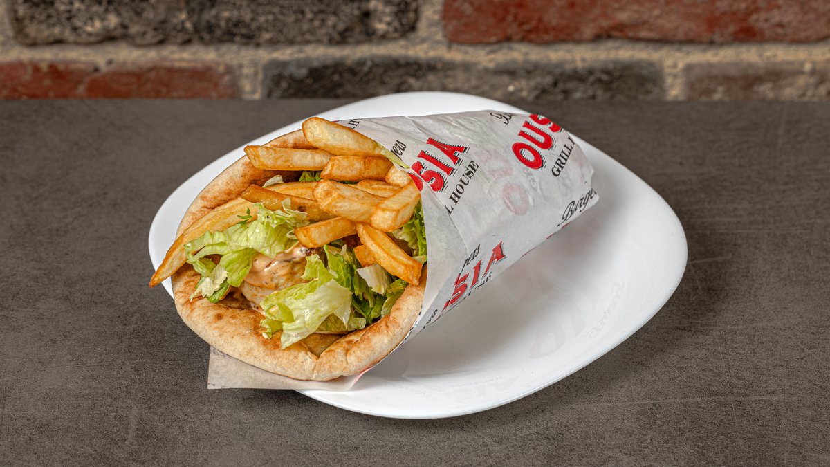 Με 3 πιτάκια, γύρο κοτόπουλο, τυρί, ντομάτα, μαρούλι και σως. Συνοδεύεται από πατάτες τηγανητές της επιλογής σου