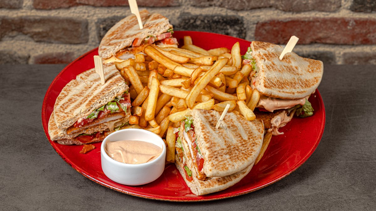 Με 3 πιτάκια, κοτόπουλο πανέ, τυρί, ντομάτα, μαρούλι και σως. Συνοδεύεται από πατάτες τηγανητές της επιλογής σου