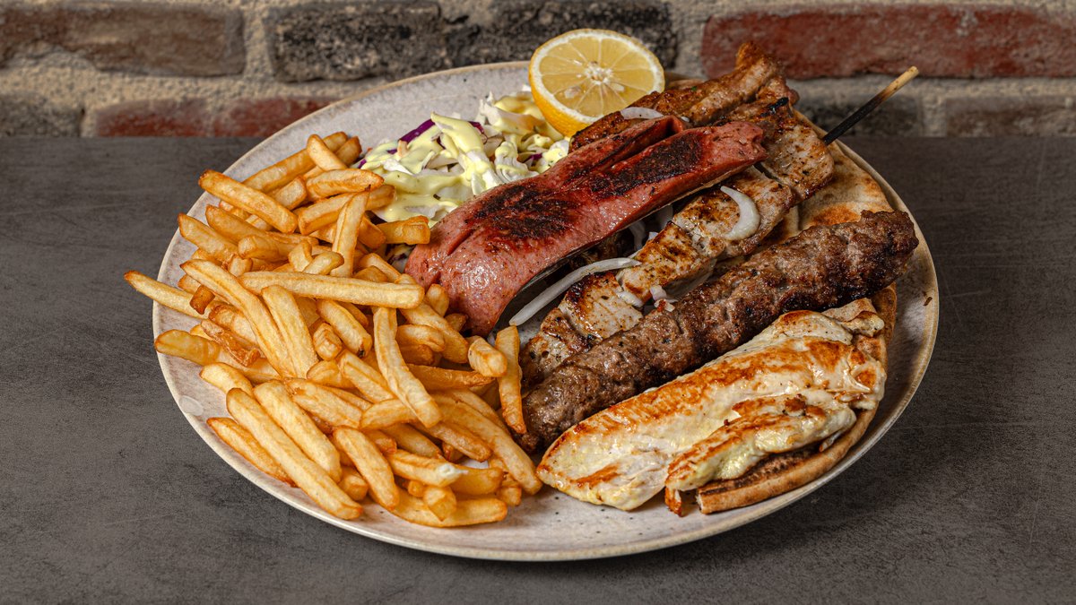 Με 2 παϊδάκια, 1 καλαμάκι χοιρινό, 1 κεμπάπ, 1 λουκάνικο χωριάτικο και πίτα
