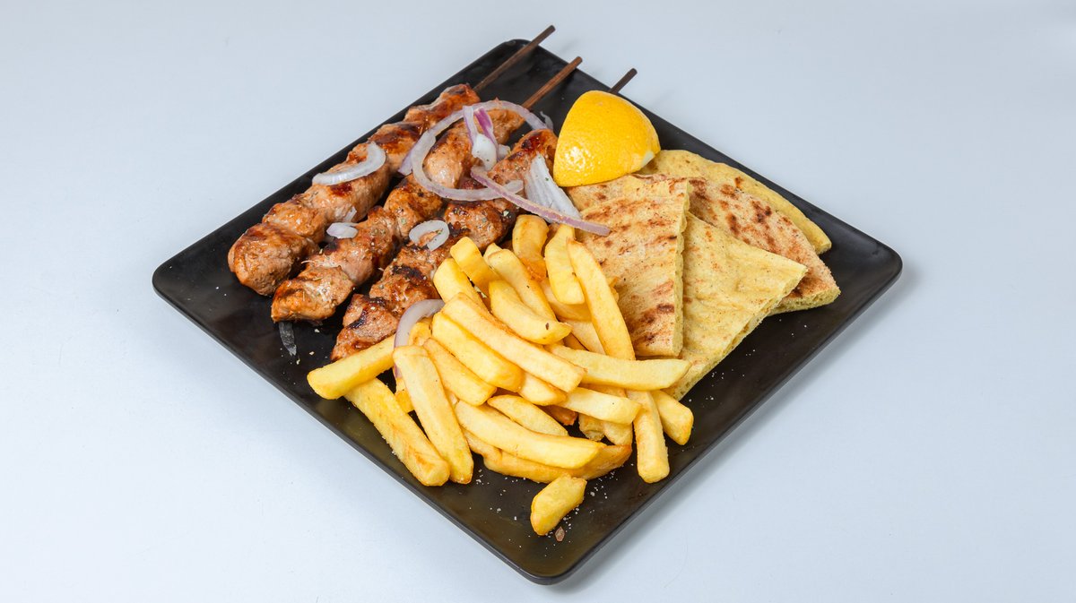 Με 1 σουβλάκι κοτόπουλο, 1 σουβλάκι χοιρινό, 1 μπιφτέκι μοσχαρίσιο, 1 πανσέτα. 1 φιλέτο κοτόπουλο και 1 λουκάνικο χωριάτικο. Συνοδεύεται από πατάτες τηγανητές