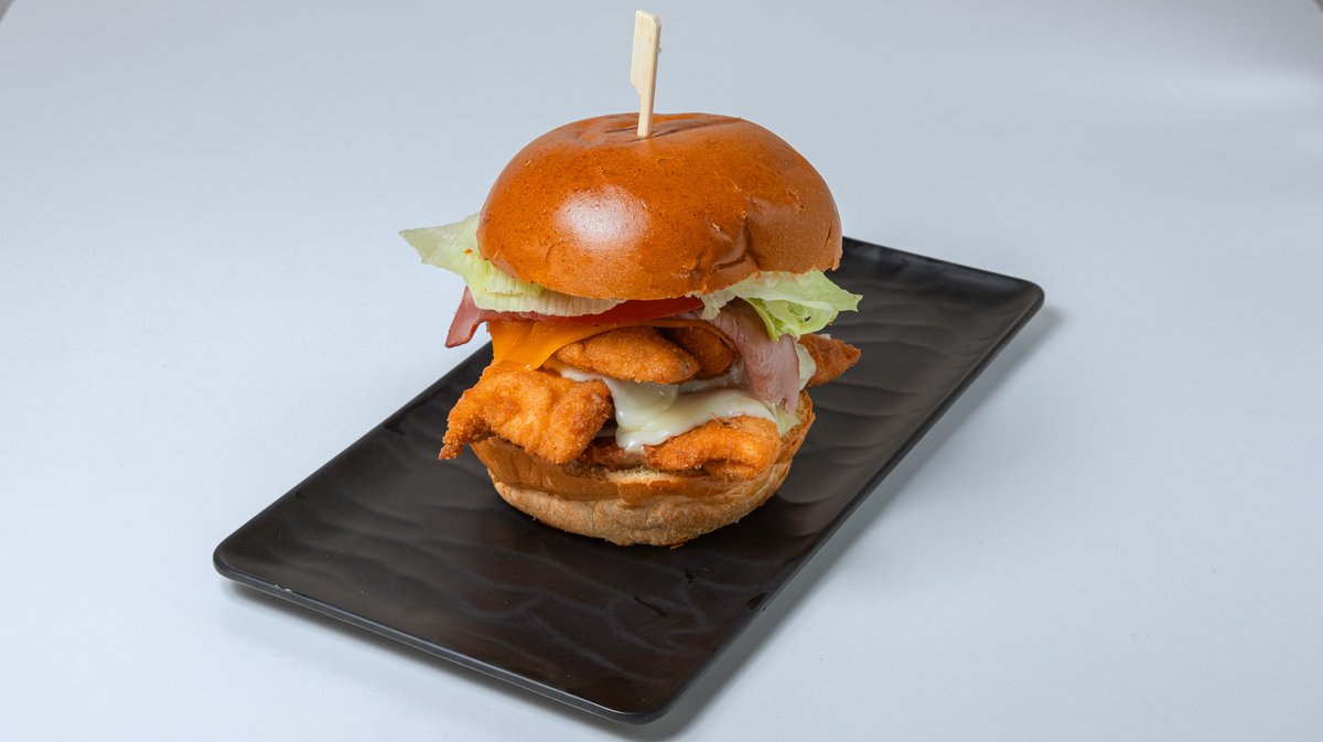 Με σνίτσελ κοτόπουλο, μπέικον, διπλό τυρί cheddar, ντομάτα, μαρούλι και σως cocktail