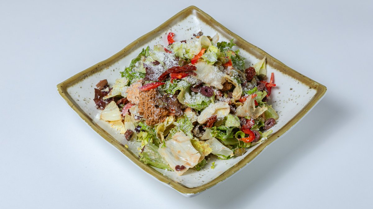 Σαλάτα με λόλα, iceberg, πράσο, κάππαρη, κόκκινη πιπεριά, ελιά, λιαστή ντομάτα, παρμεζάνα, χειροποίητο παξιμάδι, tabasco και dressing βαλσάμικο