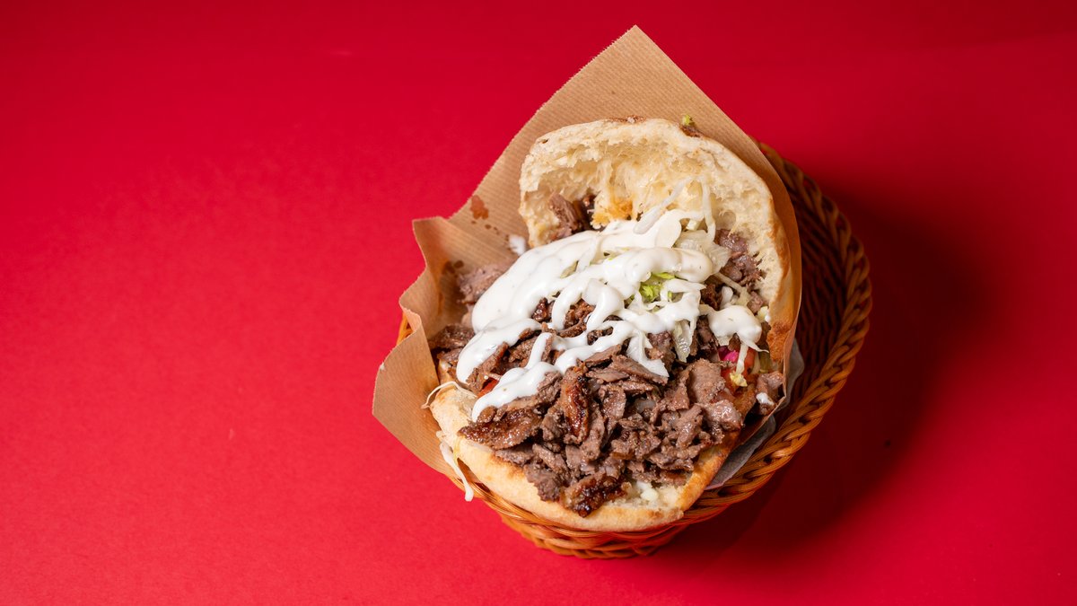 150γρ. μοσχαρίσιο κρέας με ντομάτα, κρεμμύδι, αγγούρι, μαγιονέζα, σάλτσα και σαλάτα.