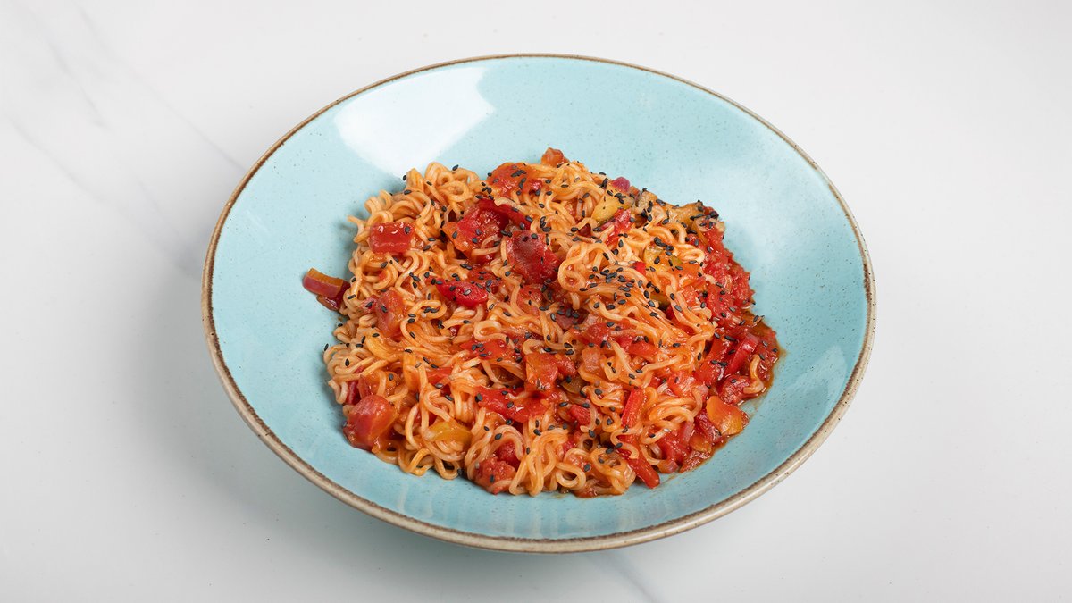 Γλυκόξινη σάλτσα ντομάτας, κόκκινη και πράσινη πιπεριά, κολοκύθι, φρέσκο κρεμμύδι και μαύρο σουσάμι
