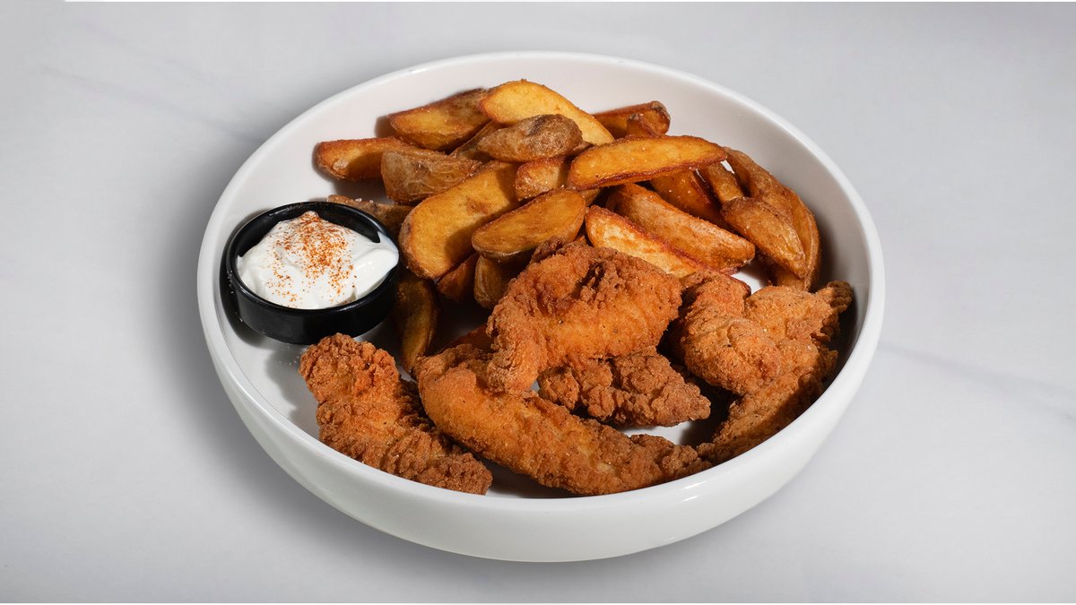 Φιλετίνια κοτόπουλο πανέ με πατάτες country και σως γιαουρτιού