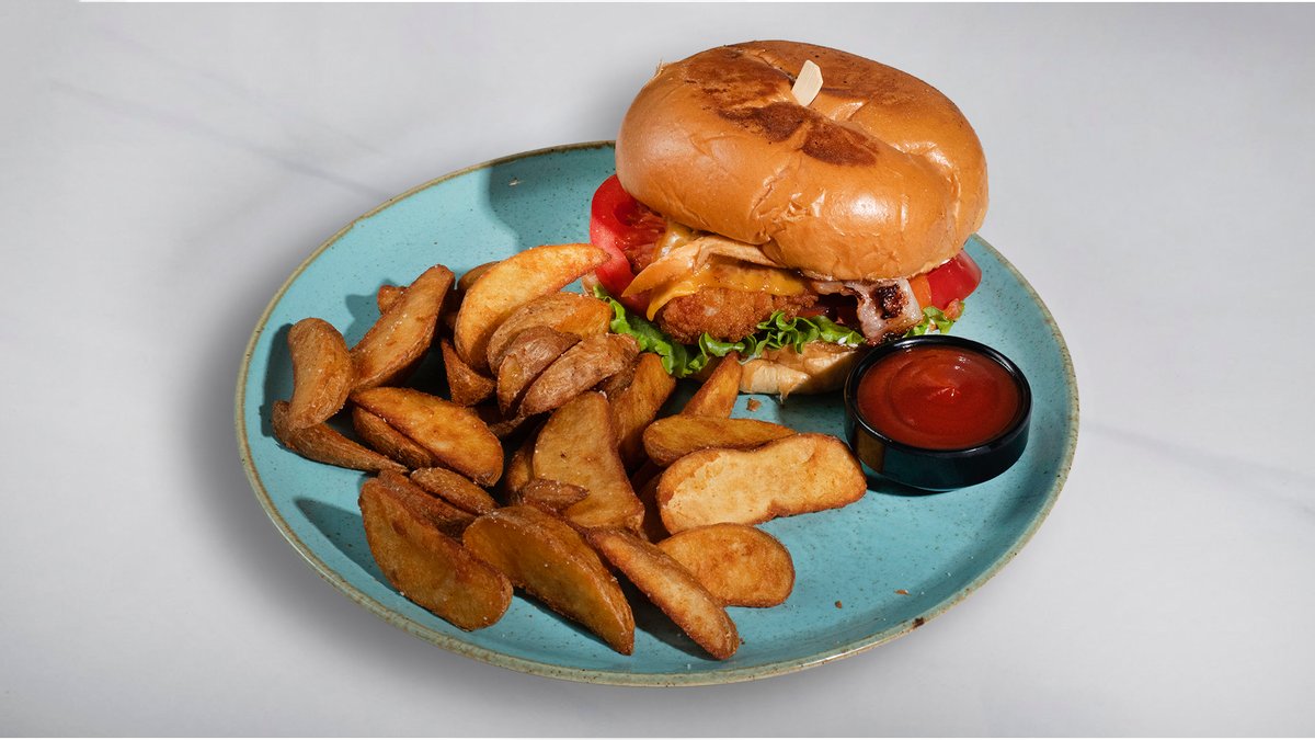 Με μοσχαρίσιο κιμά, cheddar, μπέικον, BBQ sauce, μαγιονέζα, μαρούλι και ντομάτα. Συνοδεύεται από πατάτες τηγανητές