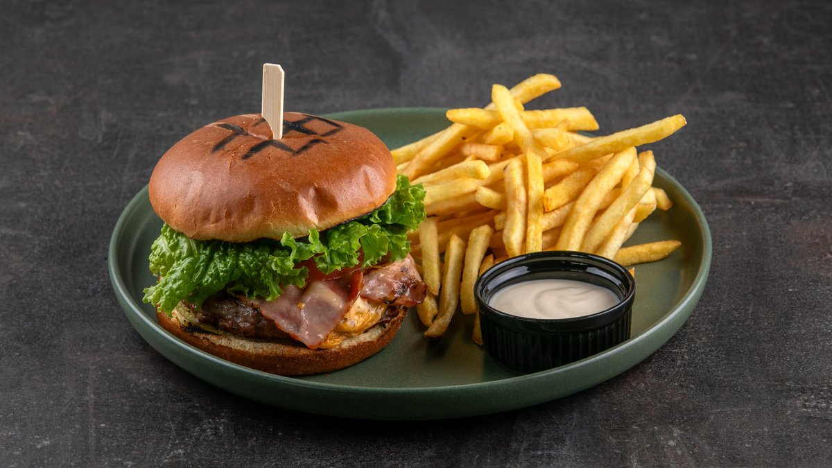 Αφράτο ψωμάκι brioche, μπιφτέκι χειροποίητο, cheddar, bacon, μαρούλι, ντομάτα, μαγιονέζα και ketchup.