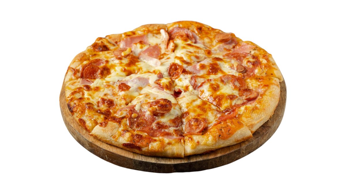 Με χειροποίητη σάλτσα ντομάτας, μοτσαρέλα, ζαμπόν, φρέσκα μανιτάρια, μπέικον, λουκάνικο και πιπεριά