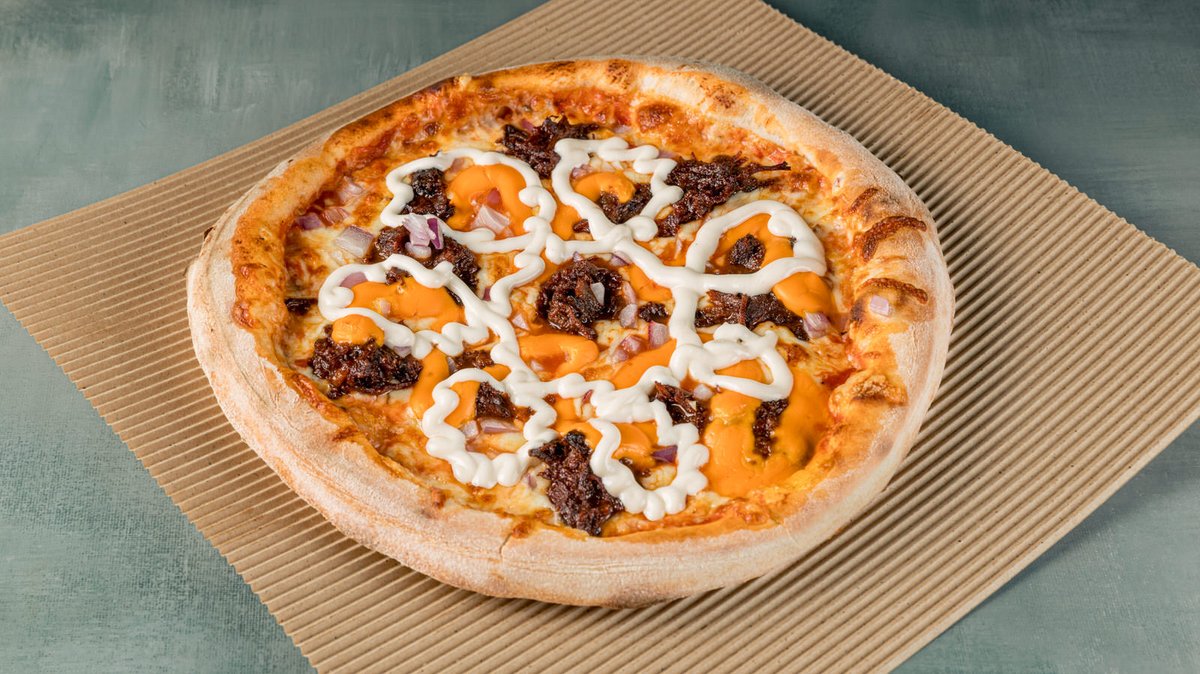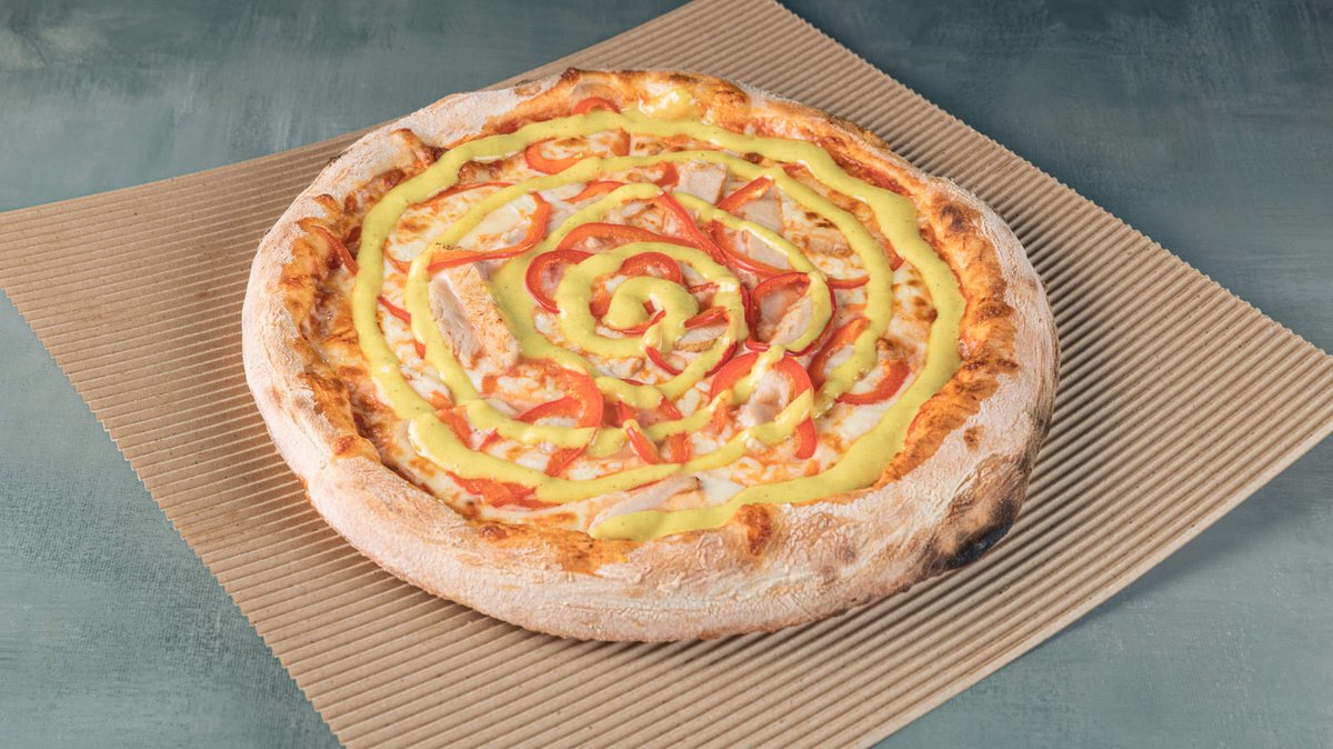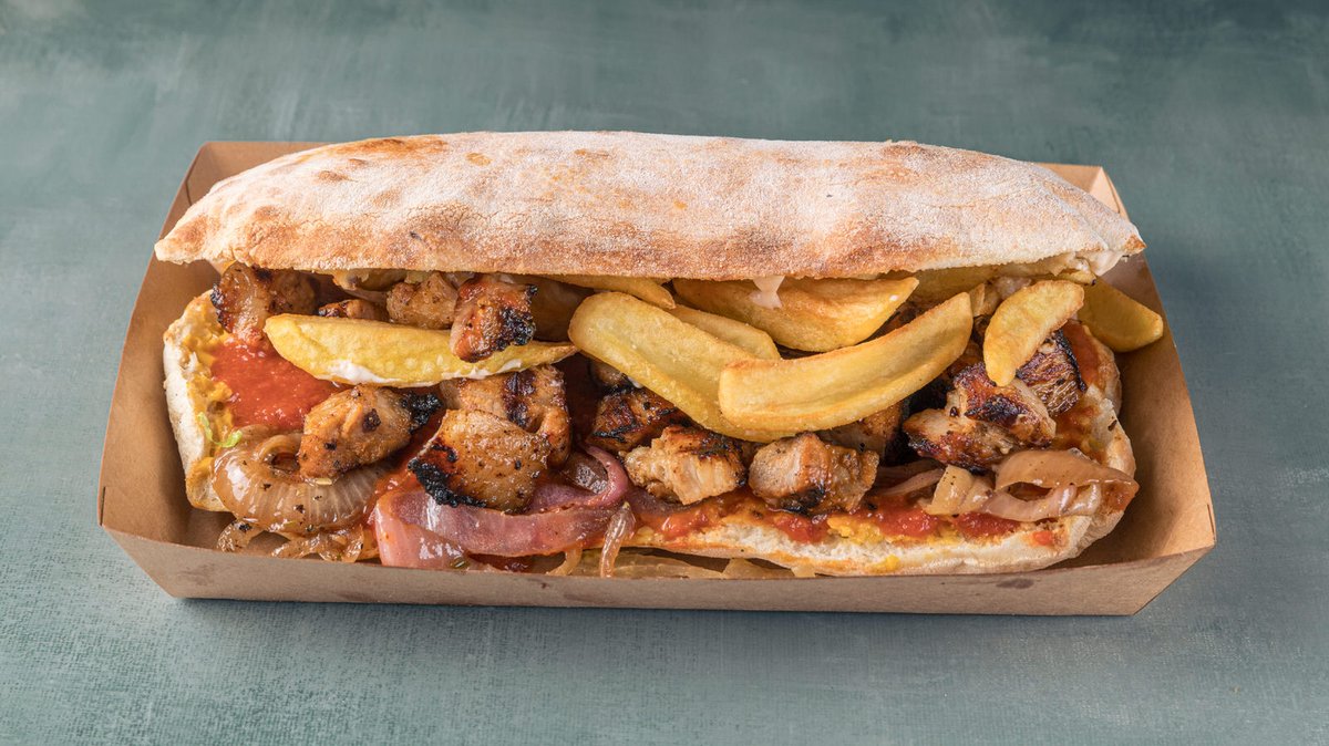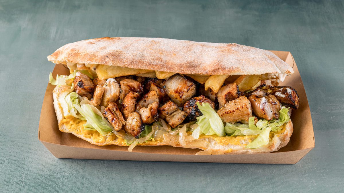 Με pulled chicken (ξεψαχνισμένο κοτόπουλο), λιωμένη μοτσαρέλα, παρμεζάνα, πιπεριές, μανιτάρια, iceberg, roasted onion saucee, μαγιονέζα και πατάτες