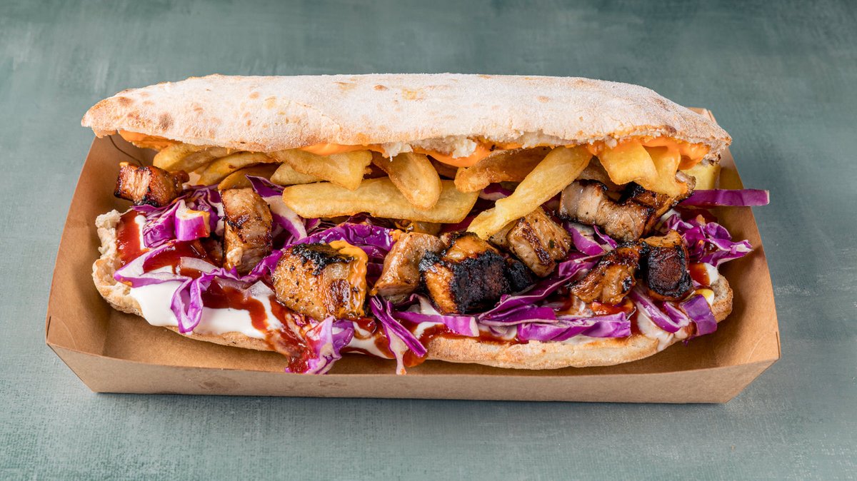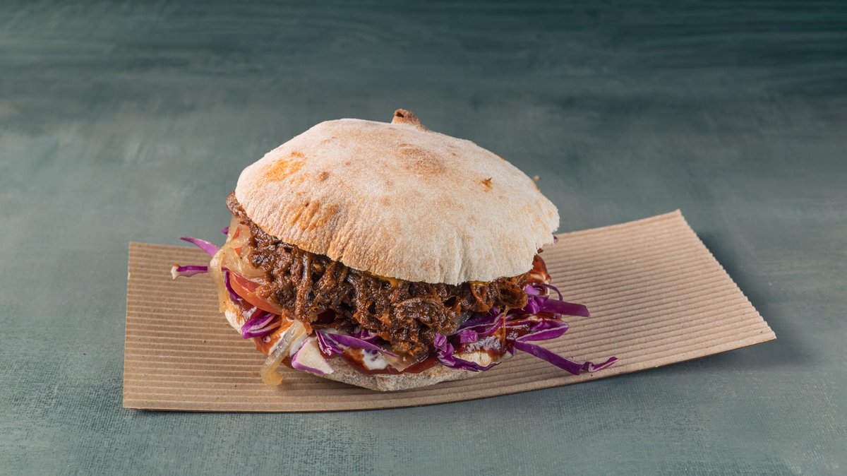 Με φρεσκοκομμένο ψωμί στο ξυλόφουρνο, pulled pork σιγομαγειρεμένο στο ξυλόφουρνο, τσένταρ, χειροποίητο καραμελωμένο κρεμμύδι, τραγανό λάχανο, χειροποίητη garlic mayo και πατάτες