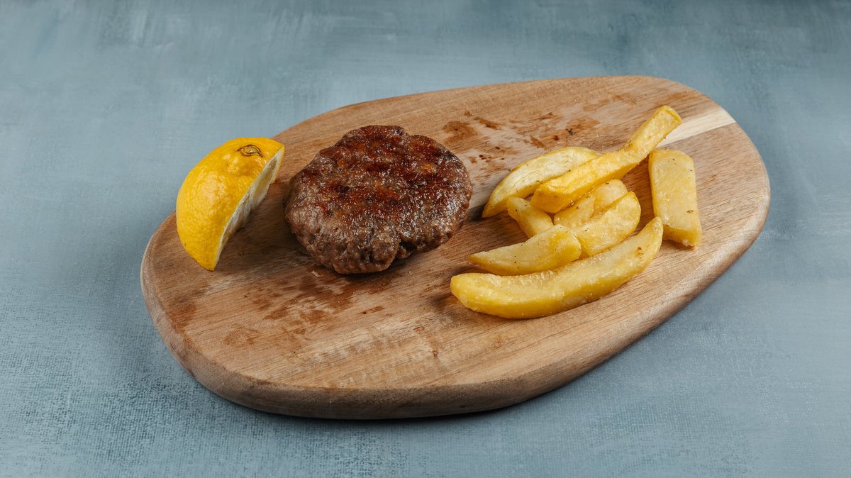 3 Τεμάχια. Χειροποίητο. Συνοδεύεται από πατάτες τηγανητές και 1 αλοιφή της επιλογής σου