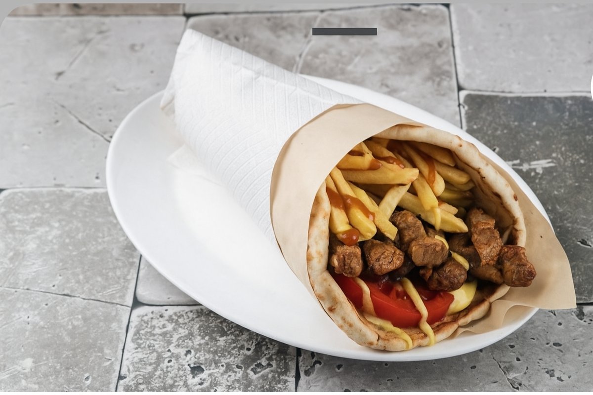 Με γύρο χοιρινό, κασέρι, πιπεριά, ντομάτα, ketchup, μουστάρδα, παρμεζάνα, τζατζίκι ή τα υλικά τις επιλογής σου Συνοδεύεται από πατάτες τηγανητές