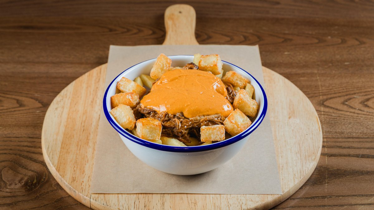 Μαδημένο σιγομαγειρεμένο χοιρινό μαζί με κρεμμύδια, τυρί και μήλο, σάλτσα τυριού, πίκλα λάχανο, τραγανό κρεμμύδι και καπνιστή σως
