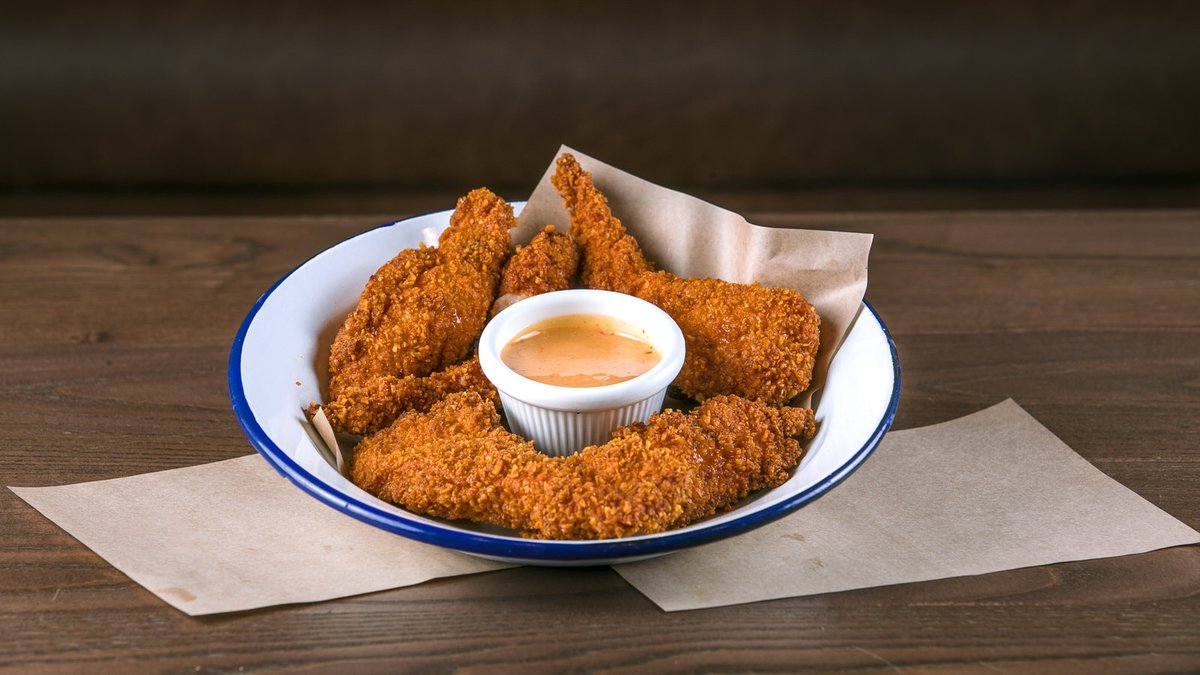 Παναρισμένο μπούτι κοτόπουλο. Συνοδεύεται από smoky sauce και πάπρικα