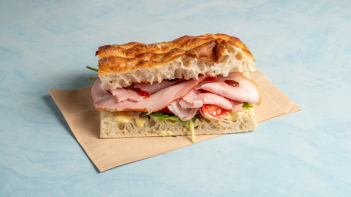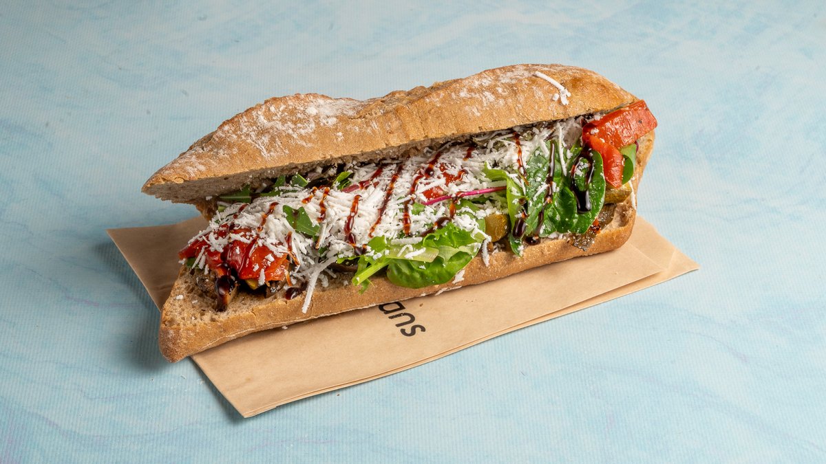 Μαύρο χωριάτικο ψωμί με προζύμι, ψητό κολοκύθι, ψητή μελιτζάνα, φέτα vegan, πιπεριά φλωρίνης, ανάμεικτη σαλάτα και κρέμα βασιλικού. Επίλεξε το μέγεθος που επιθυμείς