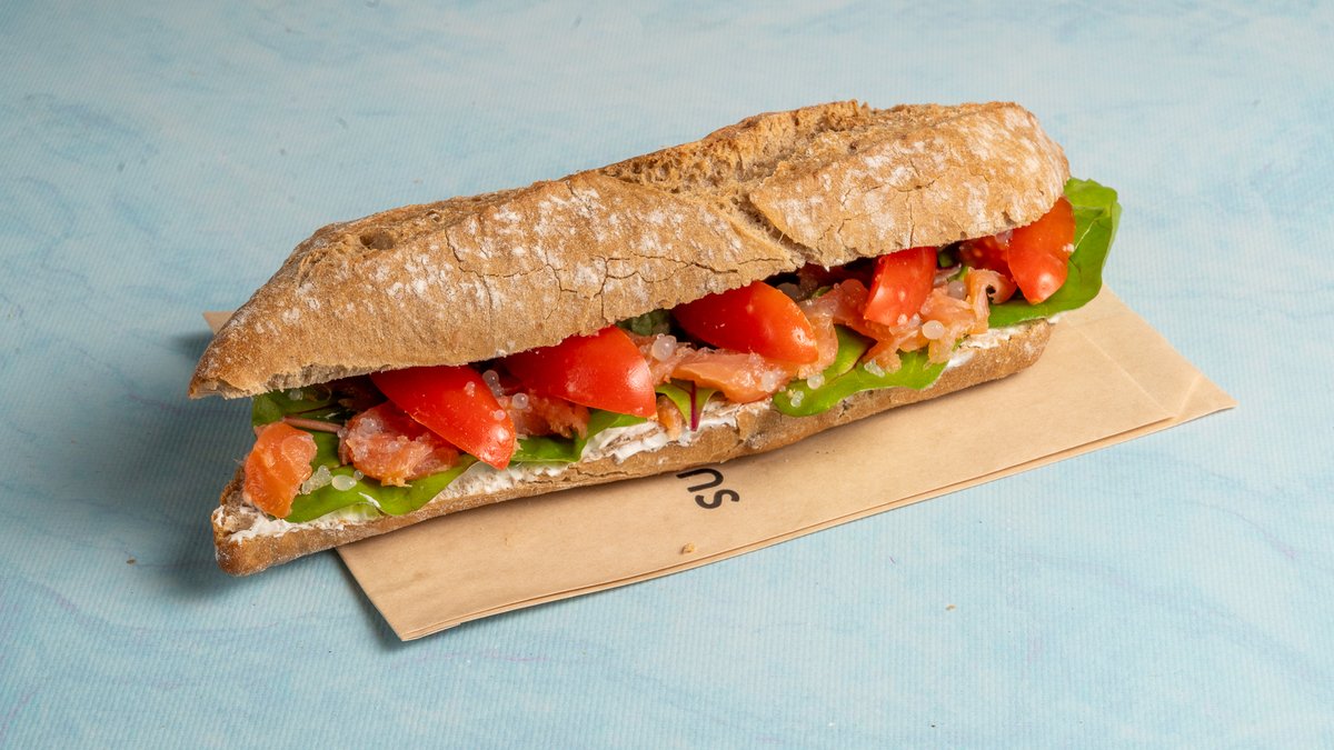 Μαύρο χωριάτικο ψωμί με προζύμι, σολομός, τυρί κρέμα, πέρλες λάιμ και ρόκα mizuna. Επίλεξε το μέγεθος που επιθυμείς