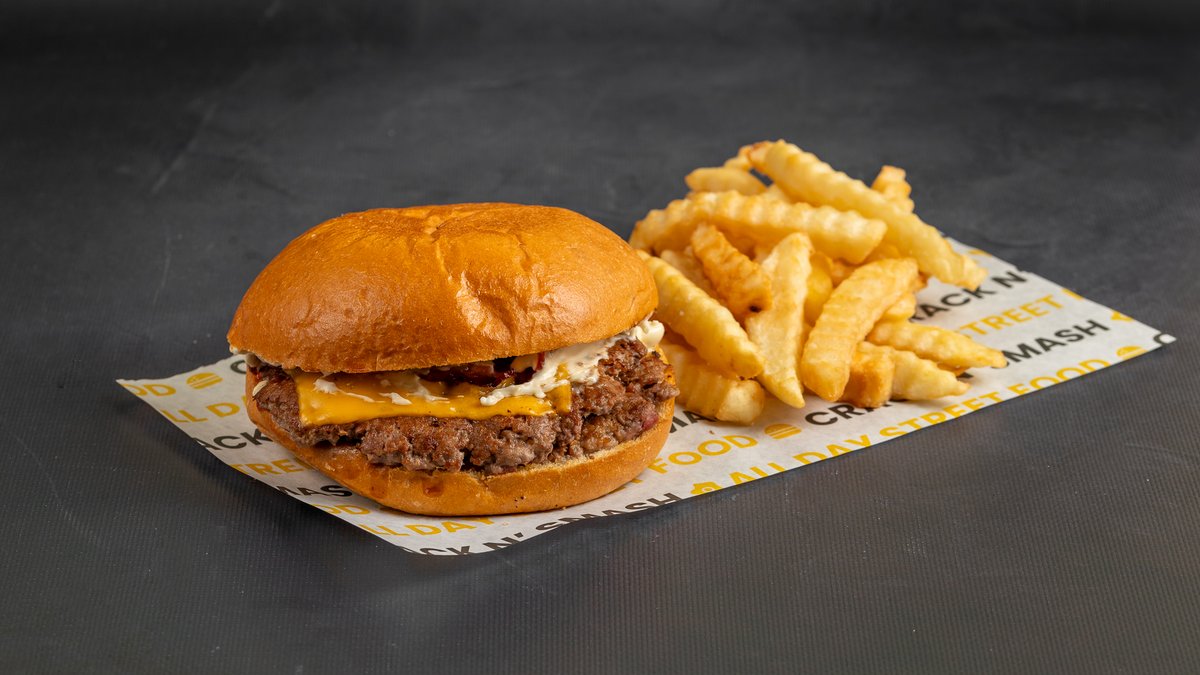 160 γραμμάρια μοσχάρι, διπλό τσένταρ, μπέικον, κέτσαπ, μαγιονέζα και τηγανητές πατάτες