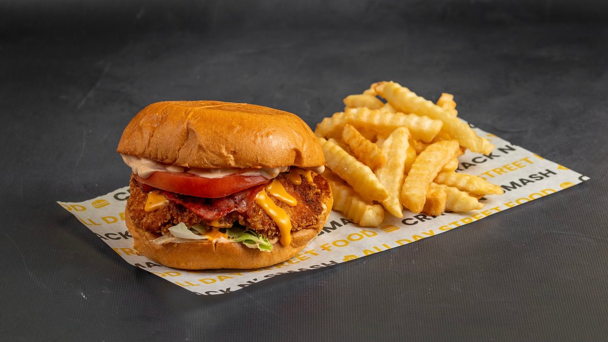 Τραγανό φιλέτο κοτόπουλο, τσένταρ, μπέικον, μαρούλι iceberg, ντομάτα, χειροποίητη σως και τηγανητές πατάτες
