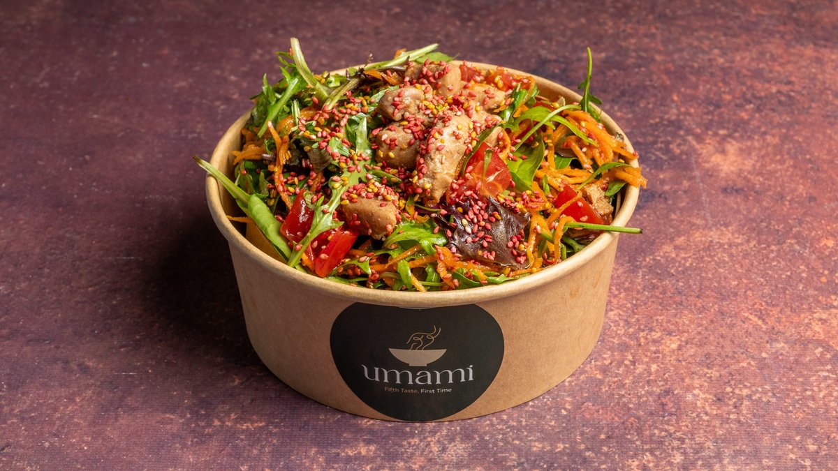 Με ντοματίνια, καρότο, μαριναρισμένο κοτόπουλο, σουσάμι Yuzu,dressing με δαμάσκηνο και τζίντζερ