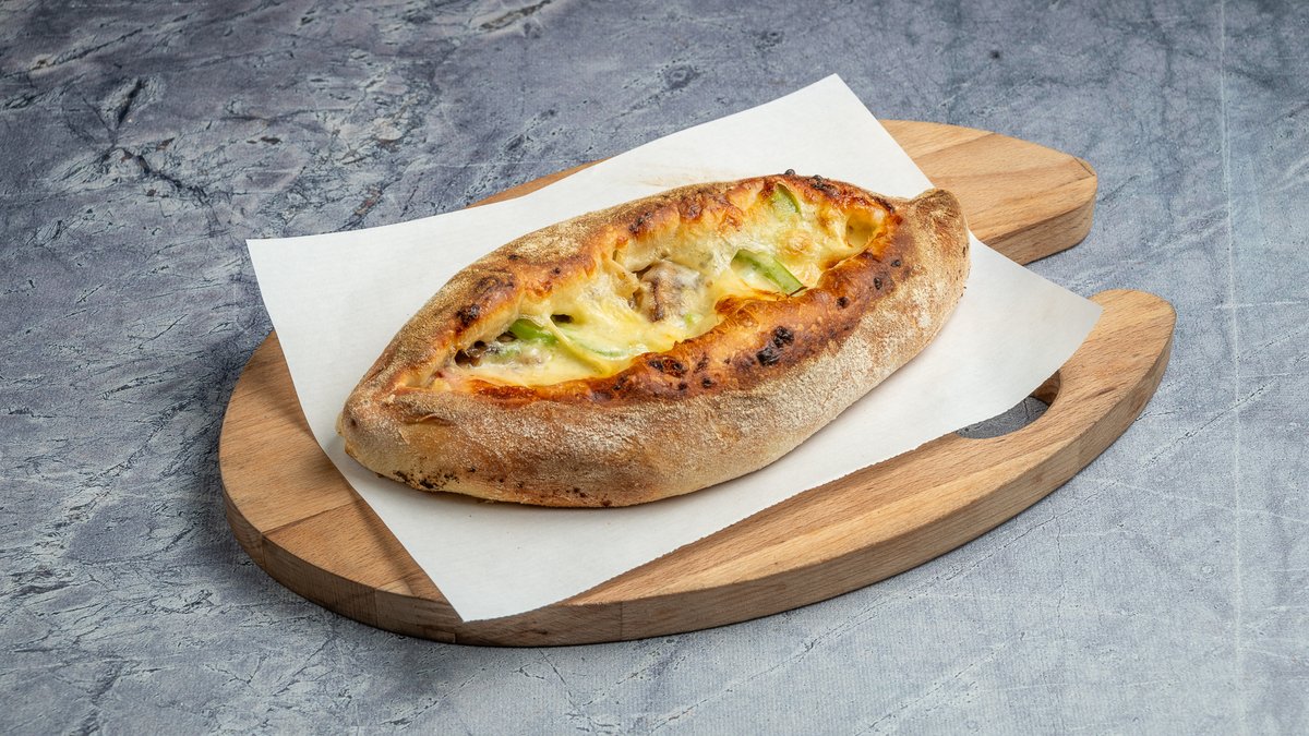 Πεϊνερλί με μπέικον, κρεμμύδι, τυρί, σάλτσα και μπιφτέκι