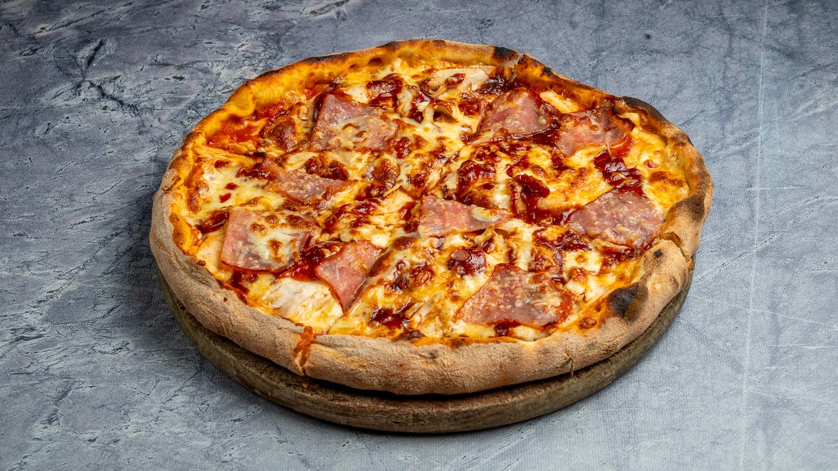 Με σάλτσα, μοτσαρέλα, φιλέτο κοτόπουλο, μπέικον, ανανάς, σάλτσα bbq και παρμεζάνα