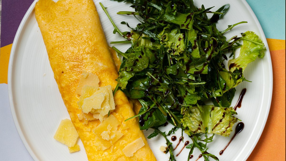 Με 3 αυγά και τριμμένη μοτσαρέλα. Συνοδεύεται από σαλάτα με πράσινη λόλα, κόκκινη λόλα, baby ρόκα, baby σπανάκι και dressing βαλσάμικου