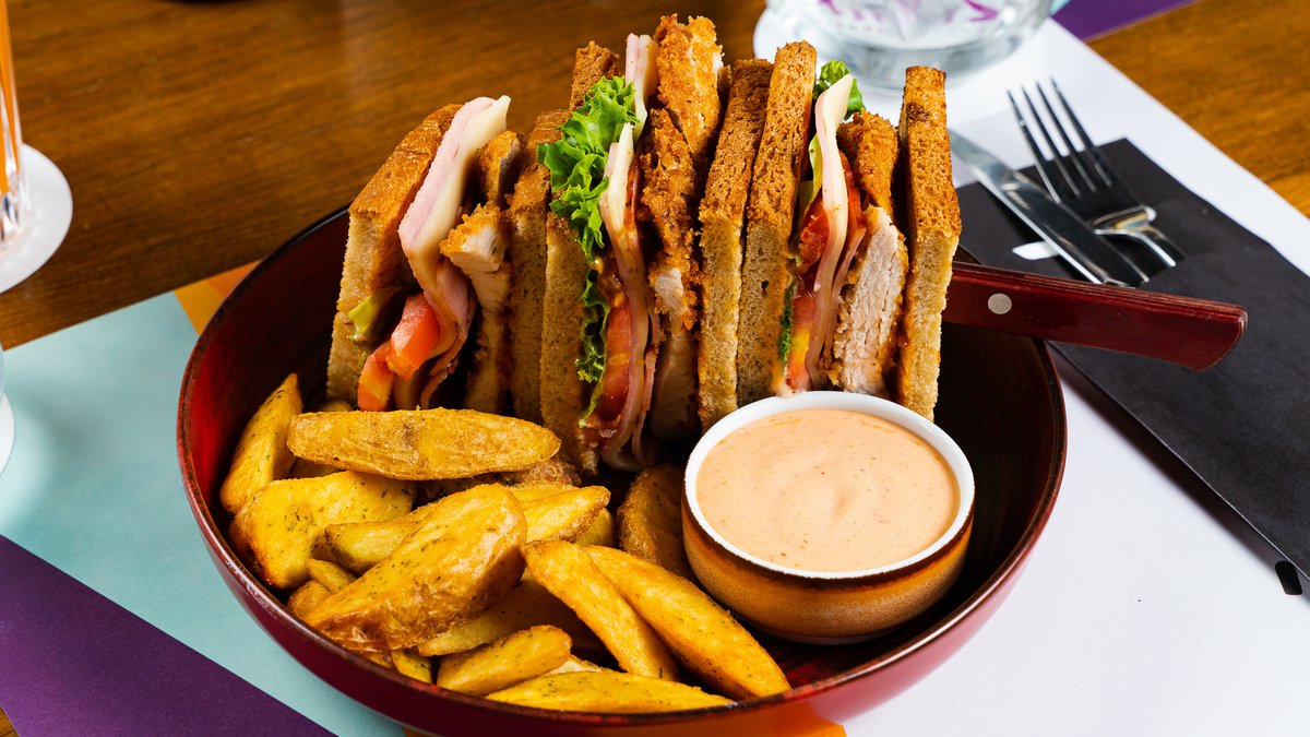 Με κοτόπουλο, ζαμπόν, gouda, μπέικον, ντομάτα, μαρούλι και μαγιονέζα. Συνοδεύεται από πατάτες τηγανητές και BBQ sauce dip