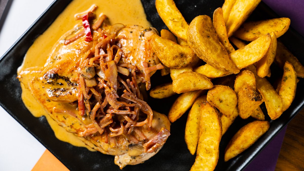 Με κρέμα παρμεζάνας, μπέικον, μανιτάρια και πιπεριά. Συνοδεύεται από πατάτες τηγανητές
