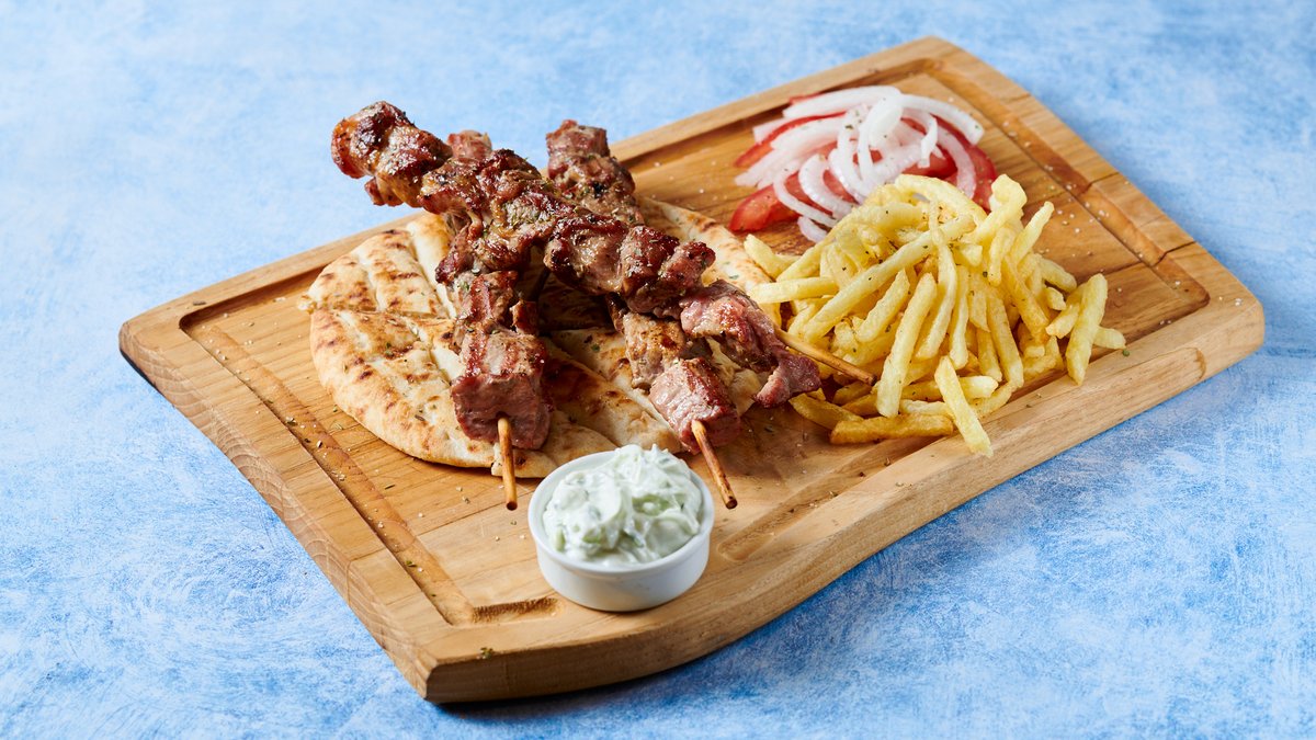 Με το κρέας της επιλογής σου. Συνοδεύεται από πίτες, πατάτες τηγανητές, ντομάτα, σαλάτα ή κρεμμύδι και της σως του.