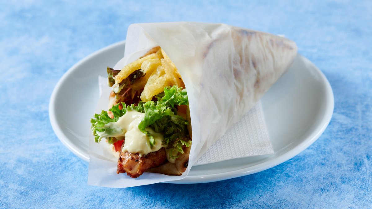Με το κρέας της επιλογής σας. Συνοδεύεται από πίτες, πατάτες, ντομάτα-κρεμμύδι ή σαλάτα & ένα ντιπάκι σως.