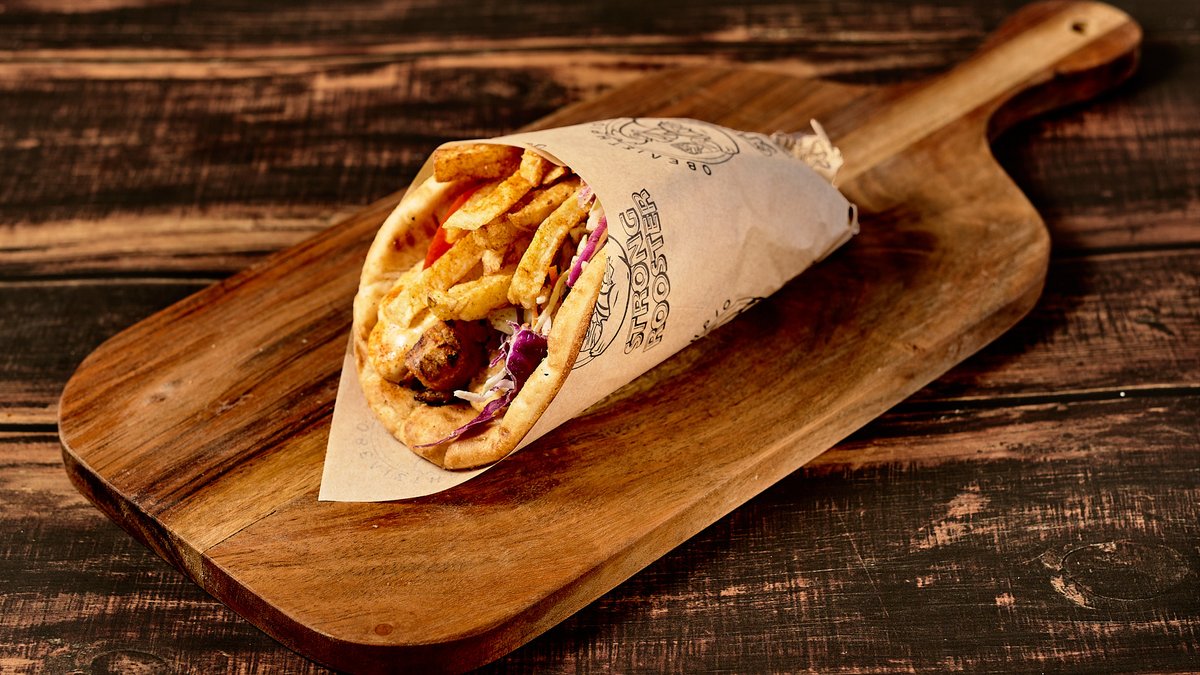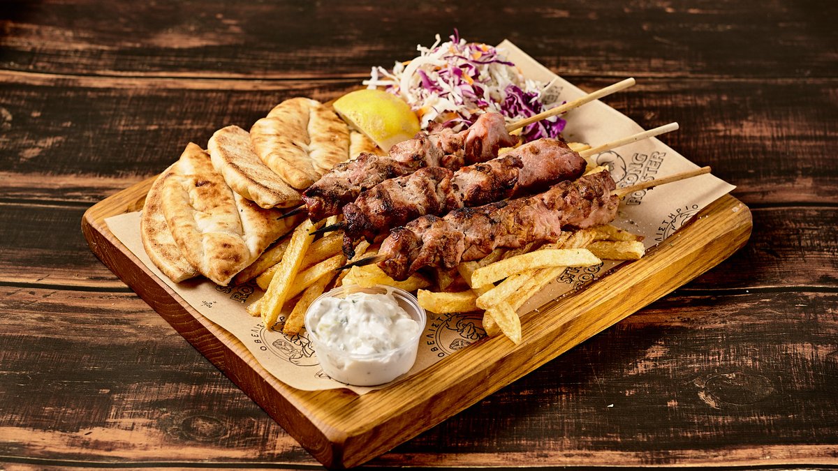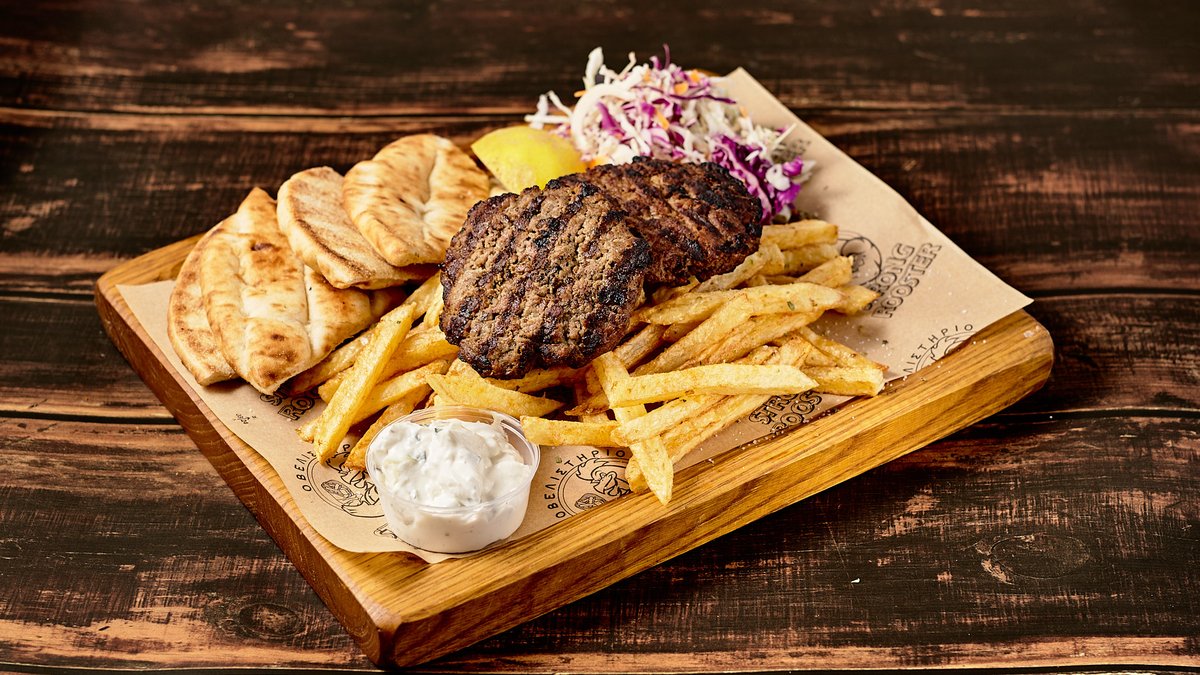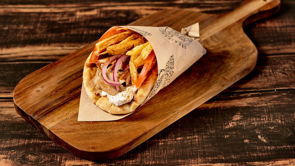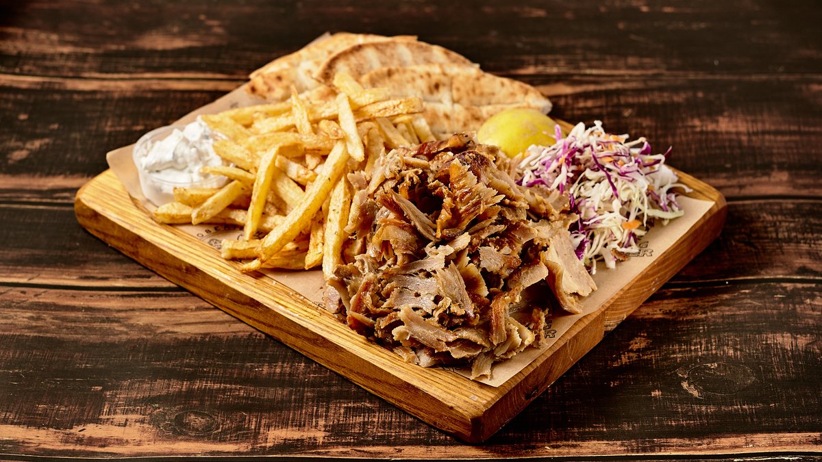 Συνοδεύεται με πατάτες, σαλάτα λάχανο καρότο, ψωμί και sauce γιαουρτιού