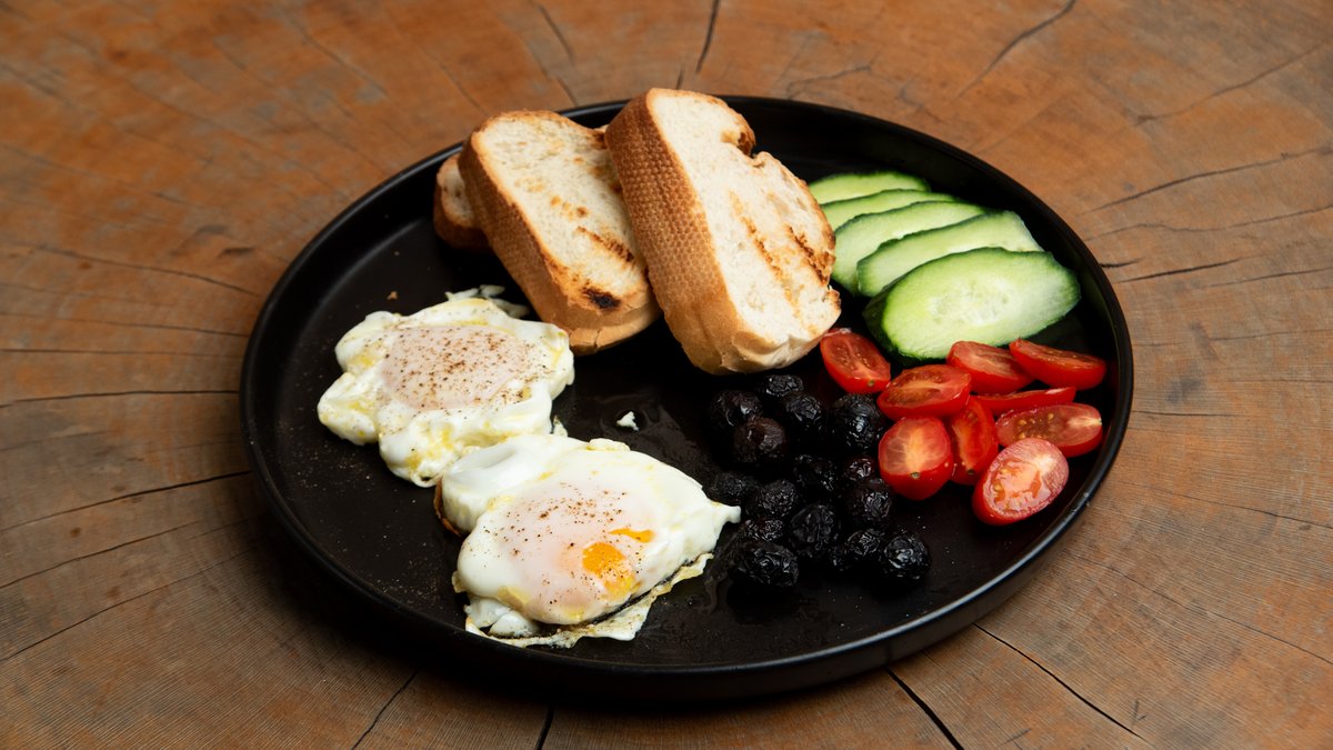 Αυγά τηγανητά με μπέικον, ελιές, ντοματίνια και ψωμί φρυγανισμένο, καφές της επιλογής σου ή φυσικός ανάμεικτος ή φυσικός πορτοκάλι ή σπιτιτκή λεμονάδα και νερό 0.5 l