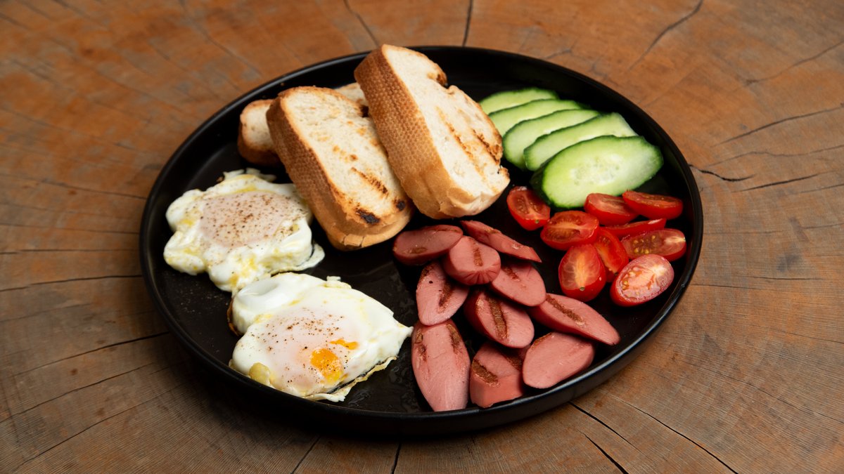 Αυγά τηγανητά με λουκάνικα, ελιές, ντοματίνια και ψωμί φρυγανισμένο, καφές της επιλογής σου ή φυσικός ανάμεικτος ή φυσικός πορτοκάλι ή σπιτιτκή λεμονάδα και νερό 0.5 l