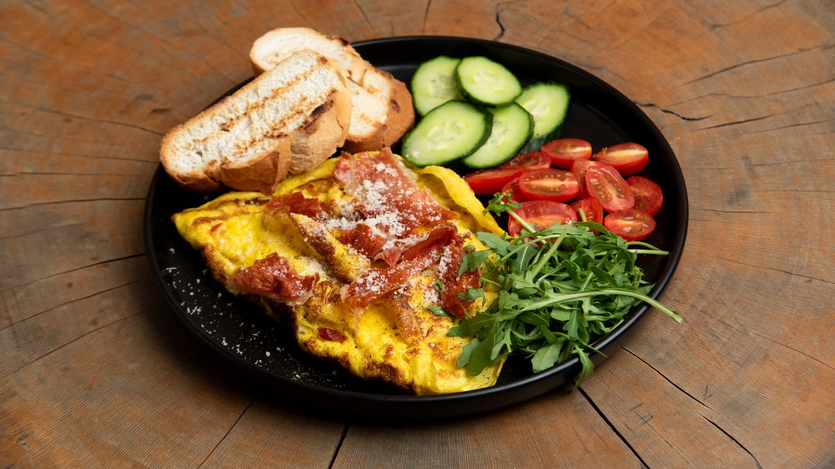 Ομελέτα με παστουρμά, τυρί, ρόκα και ψωμί φρυγανισμένο, καφές της επιλογής σου και νερό 0.5 l