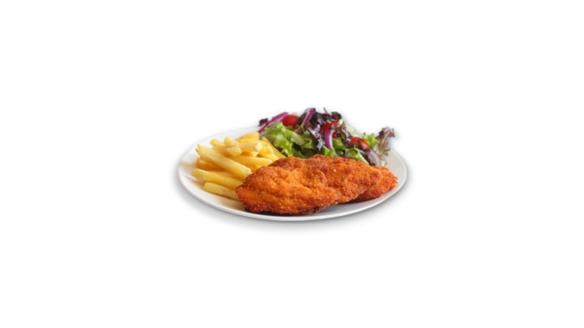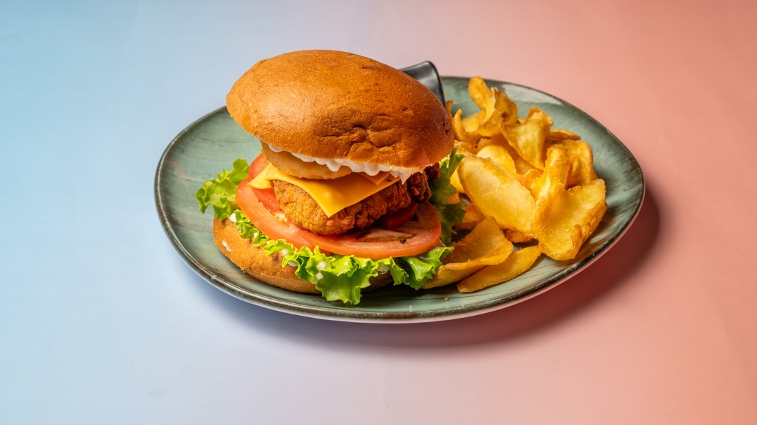 Τραγανό φιλέτο κοτόπουλο 190 g σε buttermilk, ντομάτα, μαρούλι, καραμελωμένα κρεμμύδια, τσένταρ, σως γιαουρτιού και πατάτες.