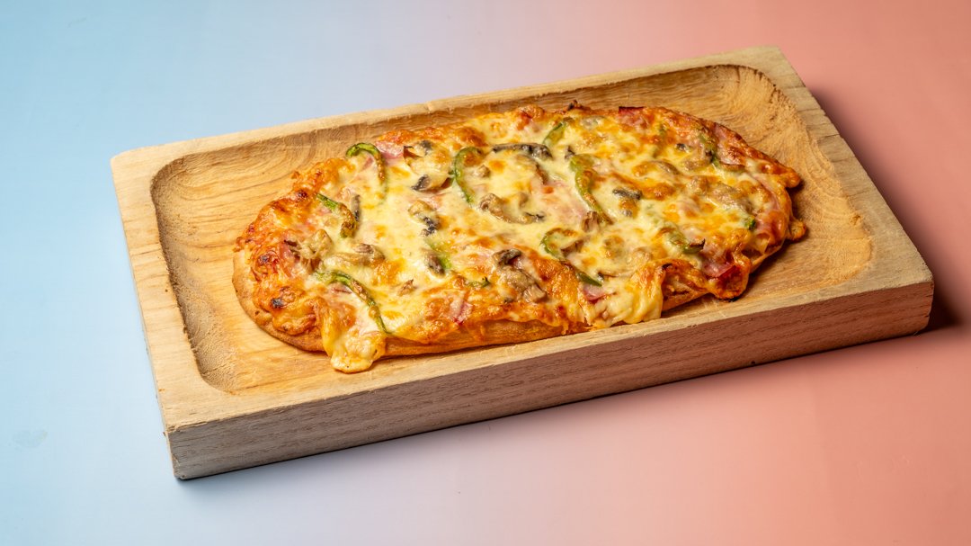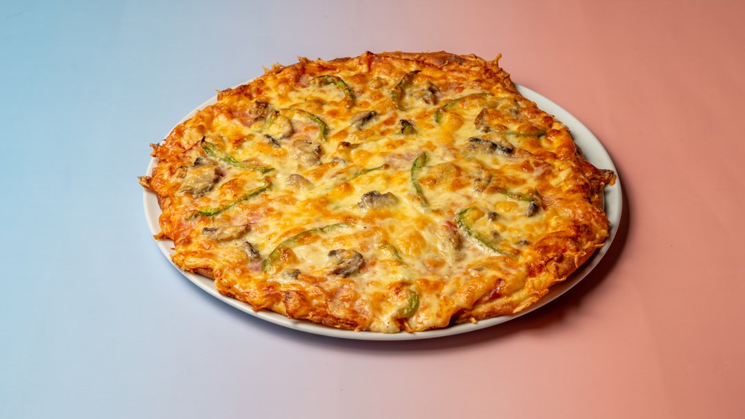 Τυρί ένταμ, μοτσαρέλα, ζαμπόν, μπέικον, μανιτάρια και πιπεριές.