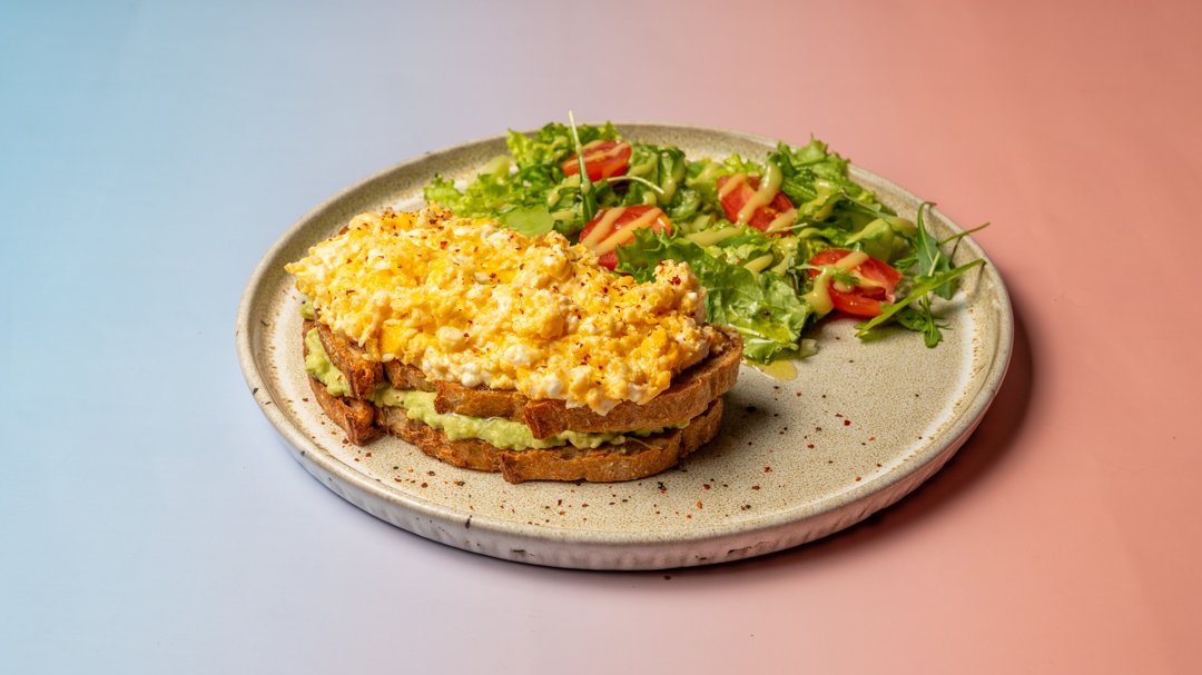 Φρυγανισμένο ψωμί με κρέμα αβοκάντο, scrambled eggs, μπούκοβο και φέτα.