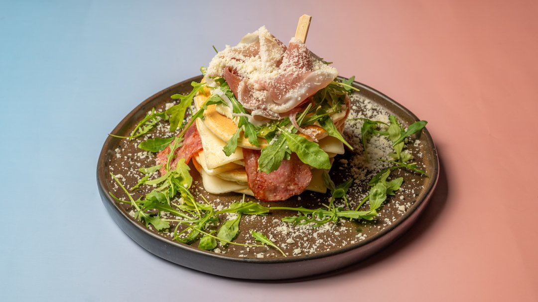 Ρόκα, προσούτο, μπέικον, παρμεζάνα, γκούντα και σως Caesar’s.