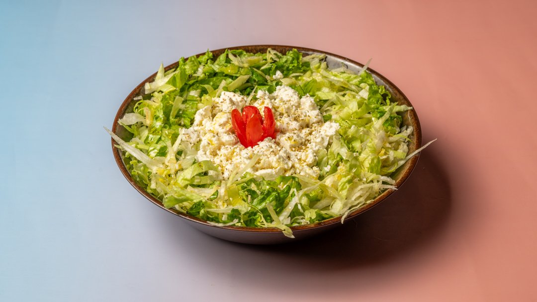 Σαλάτα κοτόπουλο, iceberg, ντομάτα, μαρούλι και γκούντα.