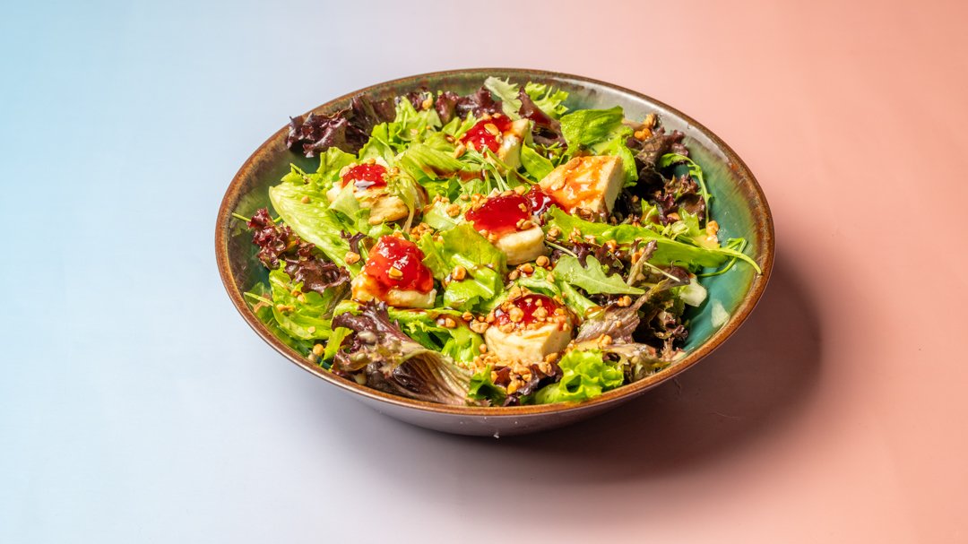 Πράσινη σαλάτα με μανούρι, μαρμελάδα φράουλα, βινεγκρέτ εσπεριδοειδών και καβουρδισμένο φιλέ αμυγδάλου