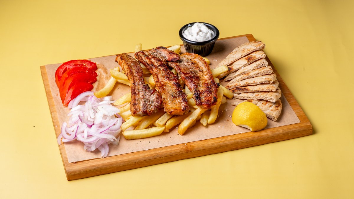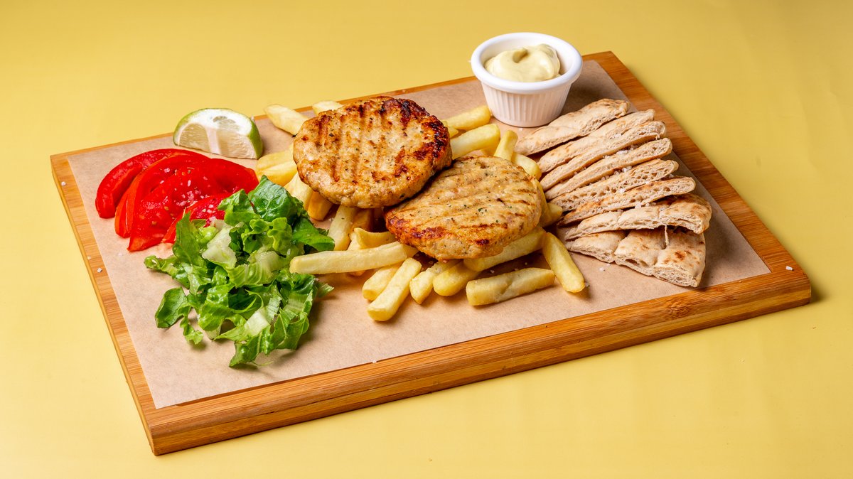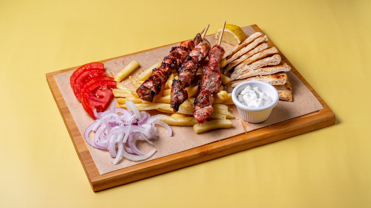 Με γύρο χοιρινό, γύρο κοτόπουλο, πατάτες, πιτάκια, μπιφτέκι κοτόπουλο, μπιφτέκι μοσχαρίσιο, κοτομπουκιές, φλογέρες κοτόπουλο, τυροπιτάκια, λουκάνικο, ντομάτα, μαρούλι, κρεμμύδι και 1 ντιπ της επιλογής σου