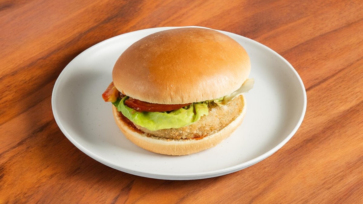 Ψωμάκι panini με μπιφτέκι λαχανικών, νηστίσιμο τυρί, κέτσαπ, νηστίσιμη μαγιονέζα, ντομάτα και iceberg. Συνοδεύεται από τηγανητές πατάτες