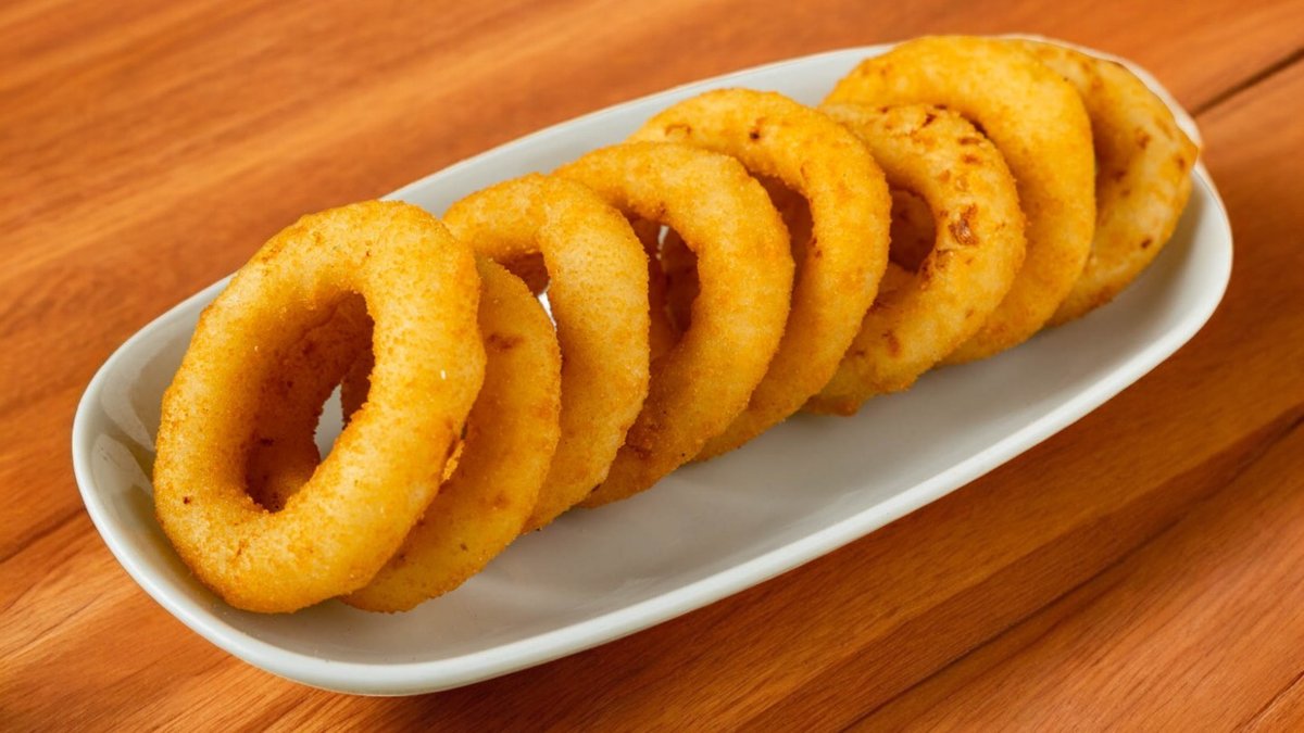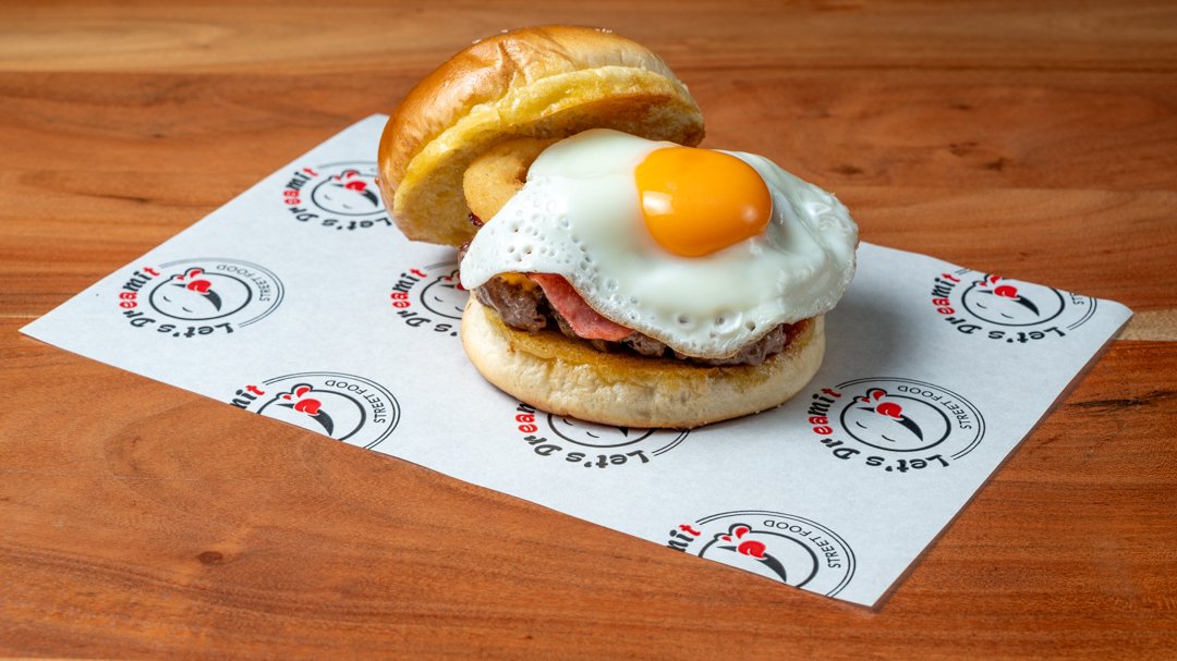 Ψωμί brioche με μπιφτέκι, τσένταρ, μπέικον, ντομάτα. onion rings, αυγό