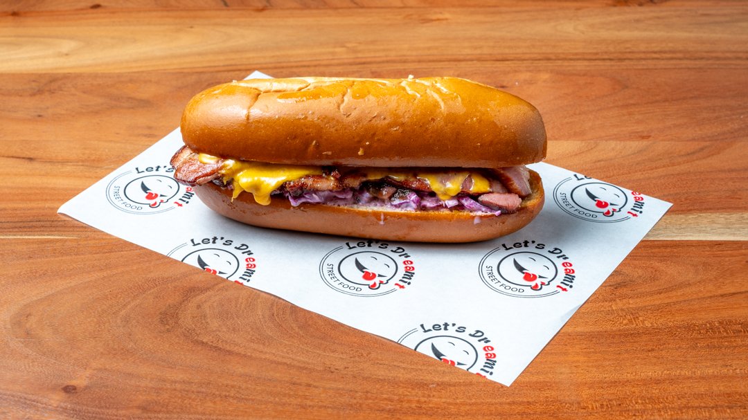 Με λουκάνικο, καραμελωμένο κρεμμύδι, πίκλα αγγούρι, κέτσαπ, μουστάρδα, μαγιονέζα, τηγανιτό κρεμμύδι